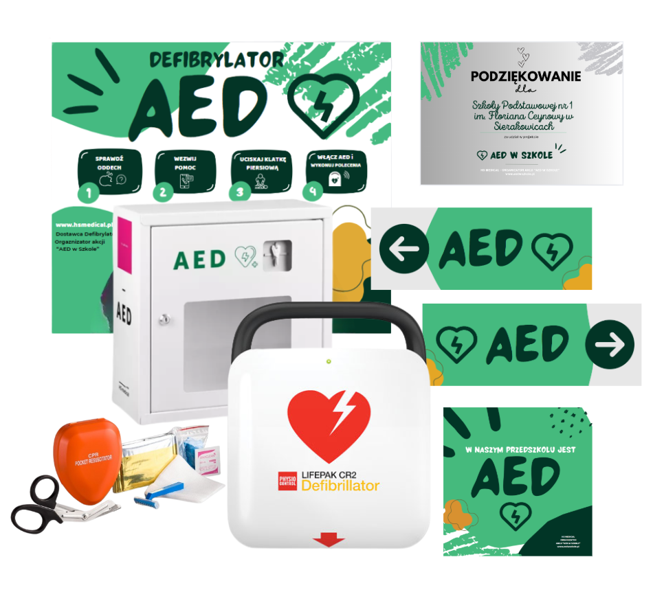 AED w szkole - to ogólnopolski projekt, dzięki któremu przedszkola oraz szkoły podstawowe i średnie wyposażają się w defibrylator AED. Wspólnymi siłami, dzięki pracom dzieci, zaangażowaniu rodziców, wsparciu szkoły i sponsorów - udaje się szybko zebrać kwotę potrzebną na pełne wyposażenie - zakup sprzętu, tablicy oraz przeszkolenie personelu.